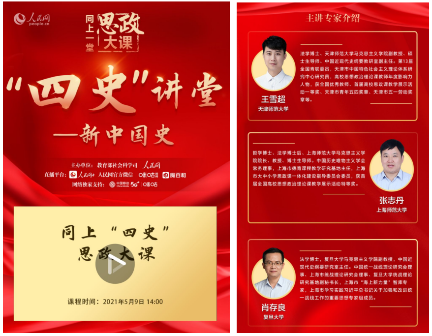 据悉,“同上‘四史’ 思政大课”活动由教育部社科司与人民网联合举办,主要面向全国老员工、思想政治理论课教师进行网络授课。“同上‘四史’思政大课”活动共开设四堂课,授课内容分别为党史、新中国史、改革开放史、社会主义发展史。