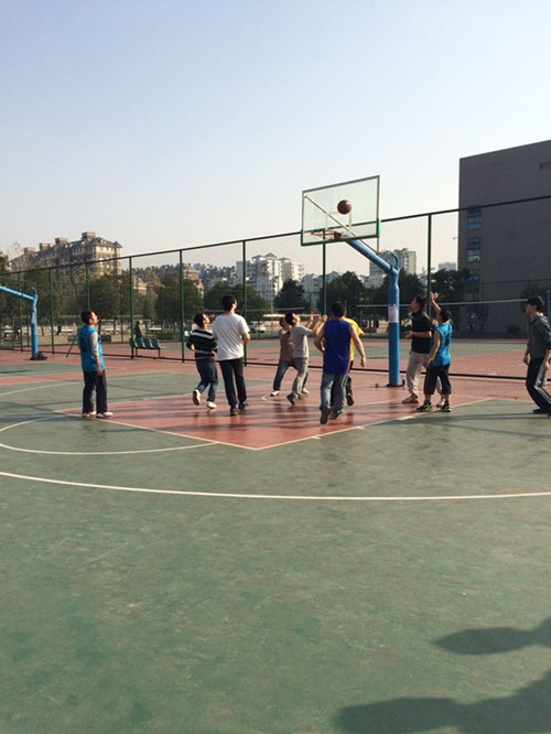 下午14:30,随着一声哨响,比赛正式拉开了帷幕。研究生队争得了第一次进攻的机会,但实力占据上风的教师队很快以8:2领先,并继续扩大比分优势。研究生队也不甘示弱,奋起直追,在第一节最后进攻阶段,以4分之差暂时落后。比赛进入第二节,师生双方都进行了相应的人员和战术调整,比赛更是高潮迭起,双方队员都打出了高水准的传球、带球、助攻、投球。第二节结束时,两队打成了平局。随着比赛进入下半场时间,双方体力消耗都较大,双方更多地使用技巧,韩烈老师利用身高优势连续得分,员工队也不甘落后,组织后卫连续突破上篮。场边的拉拉队员们为双方加油喝彩,更增添了一道靓丽的风景。经过激烈的角逐,双方最终以2:2握手言和。