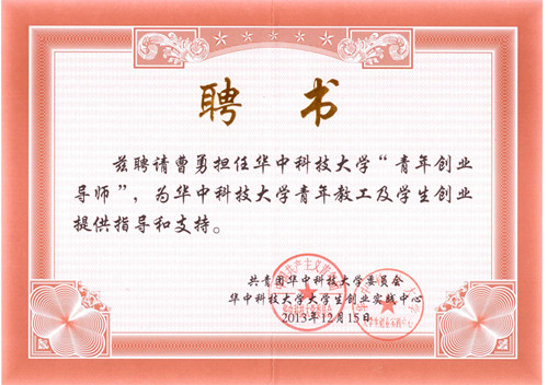阳光学者曹勇教授创业导师聘书