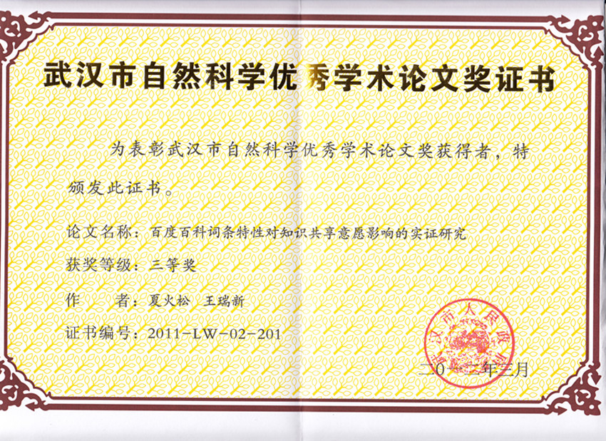 近日,从武汉市政府奖励办公室获悉,yl6776永利集团官网夏火松教授论文《百度百科词条特性对知识共享意愿影响的实证研究》喜获第二届武汉市人民政府自然科学优秀学术论文奖三等奖。