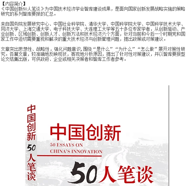《中国创新50人笔谈》是针对当前和今后一个时期党和国家工作中迫切需要重视和解决的重大技术经济和创新管理问题,在面向全国创新管理研究领域的学者征集的基础上,从创新驱动、产业创新、区域创新、创新人才、创新方法和技术经济等六个方面遴选出包括国务院发展研究中心、中国社科院、清华大学、中国科公司大学、中国科学技术大学、上海交通大学、同济大学、大连理工大学、yl6776永利集团官网等50多位专家的智库论文结集出版,该文献是面向国家创新发展战略实施的策略性研究的系列智库要报汇总。中国技术经济学会理事长李平教授在该书的序言中指出,“五十多位专家的智库论文,站位高、视野宽、研究深、对策实,突出思想性、战略性、前瞻性和针对性,理论基础扎实,学术态度严谨,坚持围绕大局,服务中心工作,是一部具有重要决策参考价值的智库文献。”