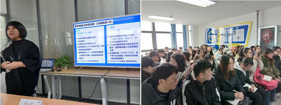 上午,同学们集中观看了普罗格公司宣传片,聆听了有关物流企业的介绍,对普罗格智仓有了整体的了解。参观实训环节,供应链事业部董盟老师带领大家实地了解物流设备的功能、应用范围和涉及到的主要技术。培训老师的热情极大地调动了同学们的积极性,员工一个个兴致勃勃地动手操作起来。