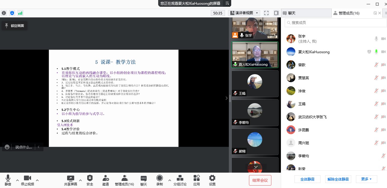 “湖北名师工作室”主持人夏火松教授交流分享了多年以来创新创业课程教学工作的心得体会,介绍了创新人才培养模式、完善课程体系和加强课程教学等相关做法与经验。